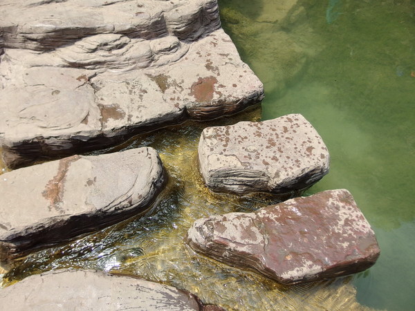 在石板橋中間,往水面照去,水面清澈,映出山壁與人影,清靜澄澈,水裡還有一塊巨大的石頭呢!