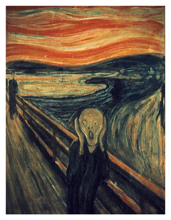 之後,孟克就想(『想』只是一個比較保守的說法,當時的他是有點過份沈迷)把當時的情景畫下來,一氣呵成式的畫了好幾幅,卻怎麼樣也畫不出當天『漫天嘶吼』的那種情緒。在最初的版本中,孟克畫的是一個沒有面孔的人在血紅的天空底下,眺望著波濤洶湧的峽灣。雖然當時的這個版本取名《絕望》,卻傳達不出畫家想要表達的恐懼感,反而讓人有種浪漫的憂鬱感。(當然,這不是我所說的。)