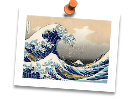 葛飾北斎 (Katsushika Hokusai) 生於1760年的江戶(現東京),是日本江戶時代浮世繪派的大師級人物。他14歲學雕版印刷,18歲便和另一位浮世繪大師勝川春章 (Katsukawa Shunshō) 學畫,開始了自己漫長且多產的畫畫生涯——但葛飾卻是等到了60歲以後才開始出名的。1826年,為了配合當時的日本內地旅遊業的發展(多半也因為個人對富士山的情有獨鐘),葛飾以富士山不同角度的樣貌為題,畫了《富嶽三十六景》一系列的風景圖,因而遠近馳名。〈神奈川沖浪裡〉一圖便就是該系列的其中一幅畫。
