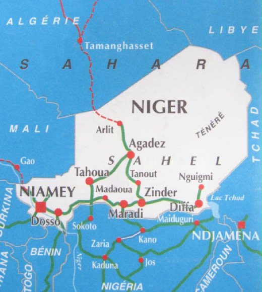 北與阿爾及利亞和利比亞接壤,南同奈及利亞和貝南交界,西與馬利和布吉納法索毗連,東同查德相鄰。全國大部地區屬撒哈拉沙漠,地勢北高南低。
