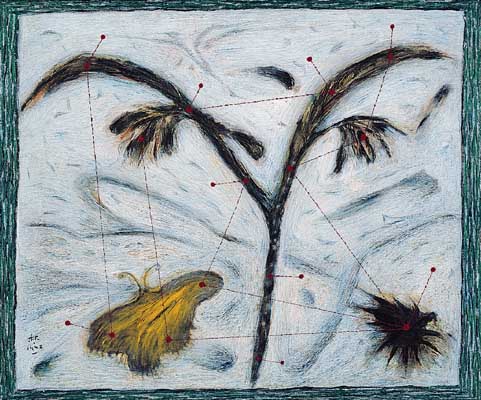 一株像羽毛的植物佔據畫幅中央,枝幹左側,一隻形貌簡化的黃粉蝶,展開雙翅定格在此,右方則掉落了一顆不知名的果實,三種自然物,構成了畫家心中的夏日意象。畫家用來固定標本的朱點,以纖細紅線有意而隨性地串連出夜空星象,彷如一幅沒有地平線的心靈地圖,飄倏而夢幻。