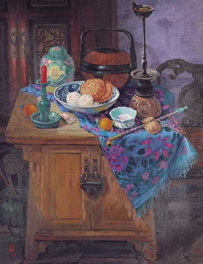 在吳承硯「舊日情懷」作品中,我們可以看到厚實沉穩的木質桌面上,擺放著幾件引發思古幽情的器物:盛裝糕餅的青花瓷盤、青銅燭台與紅燭、有喜字的彩繪陶罐、竹編提籃、油燈檯座、青花小碗等。