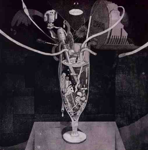 他的創作多是隱喻性的,且深具超現實色彩,如同我們現在所欣賞的這件作品,雞尾酒杯裡裝著不知名的液體,而杯子底層卻摻雜了許多文明的廢棄物,佈滿蜘蛛網的杯緣上方畫了一張嘴,似乎暗喻著人們正準備飲用這杯精心製造的飲料。
