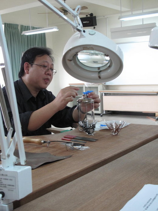 昨晚頭腦脹脹忘了補充吳守哲主任的採訪趣錄,當天為了要補拍一些他動手做作品的畫面,於是請他現場示範一下金工技法,他打趣說為了這件事情他昨晚都沒睡好,因為上次他拿起"傢俬"動手做已經是讀書年代的事情了,他是設計師所以基本上不需要自己去做;但是為了影片畫面的豐富性,他還是撩下去了!一旁的正修駐校藝術家兼任講師的蘇小夢老師一直說主任太謙虛,因為她說主任是保留實力,寶刀未老啦!