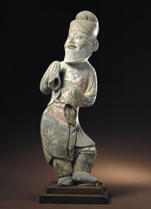 案吐火羅人著小袖袍小口袴,大頭長裙帽。波斯丈夫剪發戴白皮帽,貫頭衫,兩廂延下關之,並有巾帔,緣以織成;婦人服大衫,披大帽帔。①長裙帽即帷帽。“貫頭衫,兩廂延下關之”,或者與德國勒柯克(Le Coq)在高昌所發見壁畫中人物之像相近似。巾帔或即肩巾,大帽帔必是冪籬無疑也。②唐代盛行長安之胡服,不知果何所似?唯劉言史《觀舞胡騰》詩有“細胡衫雙袖小”之句,李端《胡騰兒》詩雲“拾襟攪袖為君舞”,張佑《杭州觀舞柘枝詩》亦雲“紅罨畫衫纏腕出”,皆形容雙袖窄小之辭,與姚汝能所雲襟袖窄小之言合。證以近出諸唐代女俑及繪畫,所謂襟袖窄小,尤可了然(參看本篇所附第一、第二、第三等圖)。其音聲隊服飾尤與波斯風為近。③則唐代所盛行之胡服,必有不少之伊蘭成分也。陶俑中著折襟外衣靿靴者亦不少。唐代法服中有六合靴,亦是胡服,為文武百僚之服,日本正倉院有烏皮六縫靴,足征唐制。④