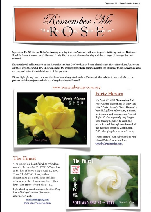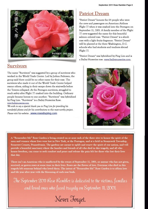 在眾多玫瑰中,非常榮幸,我的四個品種被挑選為紀念911事件的代表(註1),其中以為UA93機上四十勇者命名的‘群英’玫瑰(40 Heroes),而收到邀請函參與盛會,得以接觸到受難者的家屬,包括Dahl機長的家人,見證到現場更多的感人故事。詳情請洽「懷念」玫瑰園網站http://www.remember-me-rose.org/