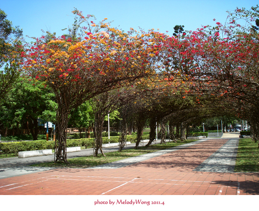 過去不是很注意這條小隧道~而如今上頭開滿了鮮豔繽紛的九重葛~!
