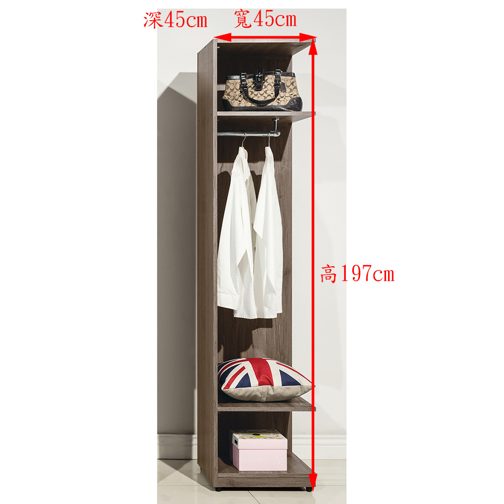 材質:正面、側面之面板,皆採用台灣製造防蛀環保低甲醛的A級木芯板。 表面專利技術灰橡木紋同調立體浮雕耐磨處理,比擬實木視覺觸感。 其他:僅販售標示家具,不含裝飾品。 ? 尺寸:寬45cm 深45cm 高197cm |