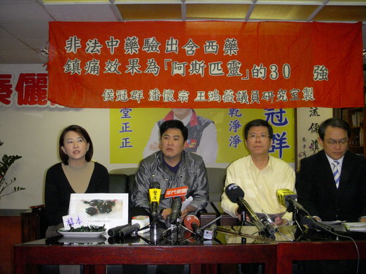 臺北市議會新黨黨團14日召開記者會,黨團召集人王鴻薇指出,近日黨團接獲民眾檢舉,有不肖份子在台北山區和寺廟中兜售來路不明之偽中藥,據陳情人透露已有上百人口耳相傳購入此種宣稱能解治各種酸痛的非法中藥。王鴻薇說,北市衛生局的化驗報告也指出內含強效消炎和鎮痛的3種西藥,其中成份鎮痛效果為「阿斯匹靈」的30倍強,市府不能不重視,衛生局應加強查緝。