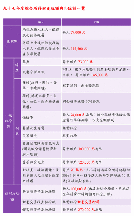 97年綜所稅免稅額與扣除額一覽表