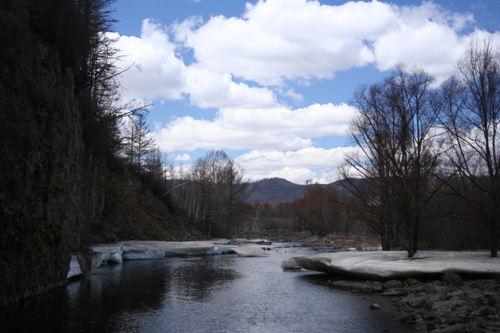 當地人都說我們來早了,雖是五月份,卻未能見到”紅花瑞雪”。但換個角度看,雖然花未開樹未綠也因此少有遊人,讓我們更能拮取大自然的寧靜,潺潺流水林海聽濤也只有在無人時能享有。世事豈能面面具到?唯有用心體會才能享受生命的各種面貌吧!在台灣,草木四季皆綠;在北方,四季分明。途中的景緻對我們而言很是特別,筆直高聳的枯木更帶有幾分蕭瑟的美。