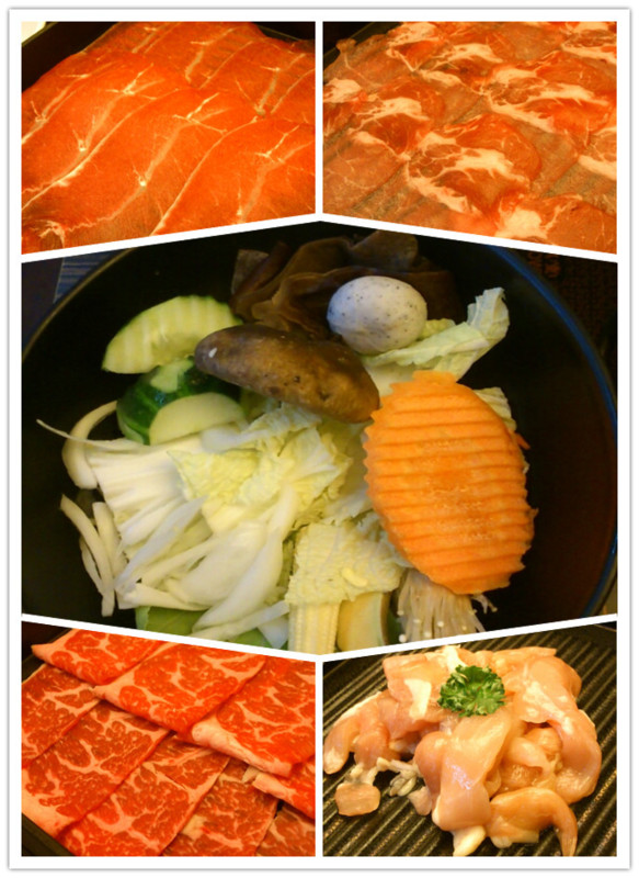 一開始會先給一盤菜和四盤不同的肉(他會先問你有沒有不敢吃的肉),肉品分別為紐西蘭低脂牛、安格斯牛小排、梅花豬肉、雞腿肉。