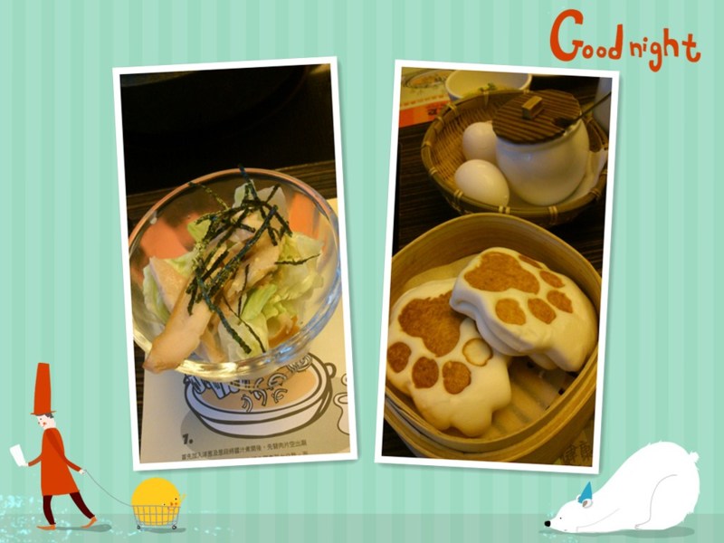 左邊是前菜,我選了燻雞沙拉~不錯吃!右邊是加點的熊掌包,夾肉超好吃!
