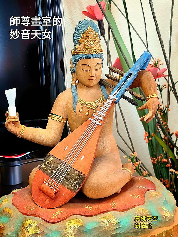 「妙音天女」被喻為音樂之神,左手輕托琵琶,右手彈奏妙音。
