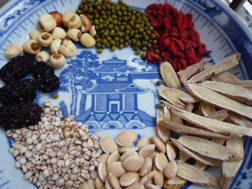 2.將前五種材料洗淨入砂鍋,加入黃芪水,急火煮沸後慢火燉40分鐘,加入枸杞一起再煮10分鐘。(我的經驗,不鏽鋼鍋水可適當增加。白扁豆和薏仁最好先泡2-3小時,紅棗去核成份易煮出來。蓮子不須泡,紅蓮子易煮,白蓮最好掰開兩邊。蓮心去掉。)