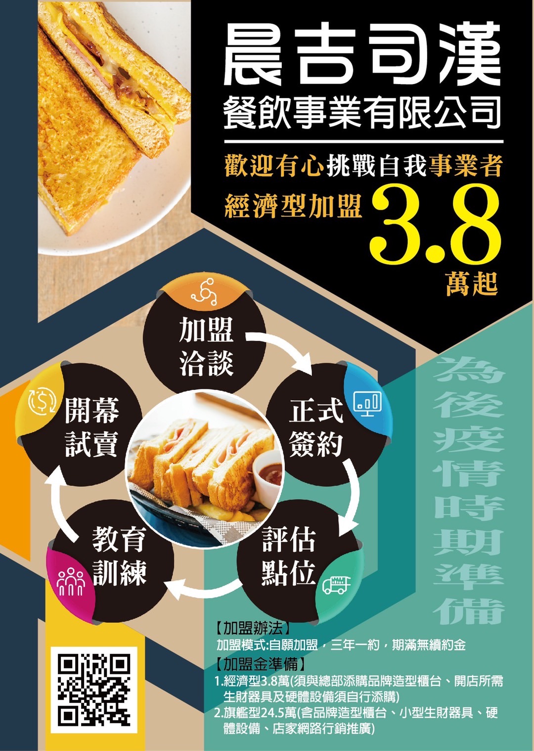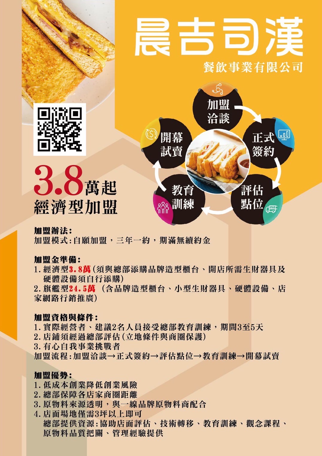 晨吉司漢餐飲事業有限公司,擁有正式公司營業登記,讓加盟者能更有保障更安心的與我們合作。創業輕鬆是我們的特色!!免權利金、免保證金、免續約金。不需要又大又華麗的店面,肉排蛋吐司以餐車方式作生意,降低租金及裝潢的費用,產品簡單且快速,以效率來提升營業額。