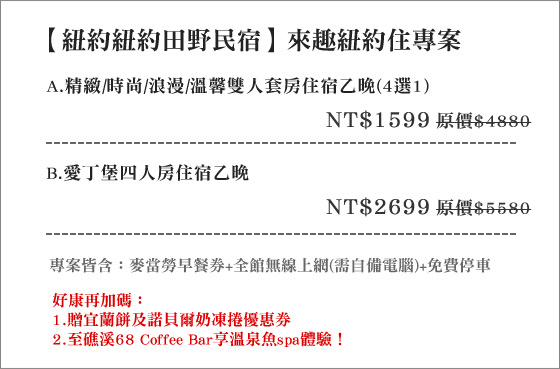 商品訊息簡述: 只要1599元起即可享【紐約紐約田野民宿】原價最高5580元來趣紐約住專案:(A)精緻/時?浪漫/溫馨雙人套房住宿乙晚(4選1)/(B)愛丁堡奶H房住宿乙晚,專案皆含:麥當勞早餐?+全館無線上網(需自備電腦)+免費停車。好康再加碼:1.贈宜蘭餅及諾貝爾奶凍捲優惠券、2.至礁溪68 Coffee Bar享溫泉魚spa體驗!