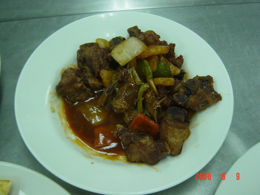 圖二鳳梨糖醋小排(我的醬油放太多了^^||,顏色變得不好看,而且配菜太早放下去,都呈現奧奧<台語>狀,再者明明又油炸又紅燒,沒想到排骨還是沒爛^^||)