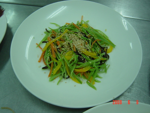 圖三芝麻三絲四季豆(又是刀工鉅作,四季豆居然還要切絲??而且我明明燙不久,但菜還是一副很爛的樣子><~,感謝同組的媽媽幫我乾炒芝麻~~)