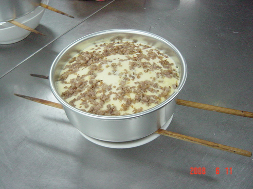 圖一鹹蛋糕出爐了~(放糖攪拌時忘了分一半,結果全部倒到蛋黃裡,雖然我覺得反正蛋黃蛋白最後還是會攪和在一起,老師也說沒差,但依舊被某大哥ㄎㄠㄙㄟˋ 個半天...)