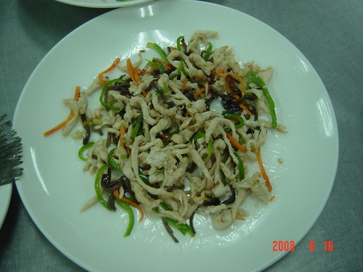 圖二三色炒雞絲(阿英老師的雞絲炸的很好吃,我切的雞絲則是很受稱讚