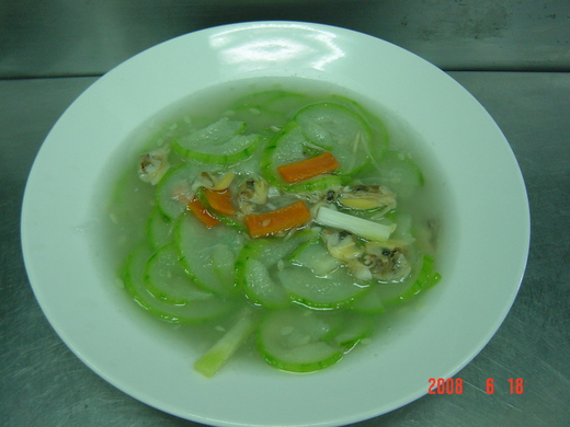 圖三蜊肉燴絲瓜(老實說這六道菜因為中午吃肉包跟糯米糕還有肉粽+可樂而太飽了,晚餐根本無法吃下任何東西了~所以無法於口感中評論^^||僅就外型講一下感想。我們組的絲瓜那位大哥煮的太久,導致湯汁過多,絲瓜還邊邊都焦掉了...而且大哥太一意孤行,不只讓我很生氣,連組上另一位媽媽阿英老師都很受不了><~)
