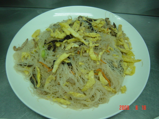 圖三香菇蛋皮炒米粉(真的要放肉絲炒米粉才會好吃吧~可是因為有位吃素的組員,只好忍耐,可是有蛋皮還不是不能吃><~,再說他也老早分了好多米粉去做他的素食酸辣多油米粉湯去了啊~~....)