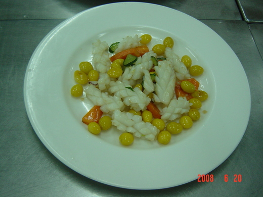 圖二白果炒花枝捲(炒菜時真的是緊張的不得了,連我早已每樣食材都穿燙過了都忘記,所以炒過頭,花枝邊邊有點焦><~)