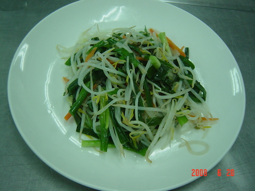 圖三韭菜涼拌豆芽(感覺像是瞬間完成的一道菜,這次我有每道菜都多加了鹽與糖,卻依然味道不足,起碼無法迎合我的口味><~)