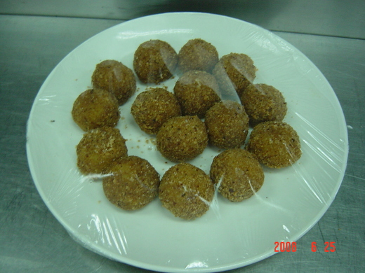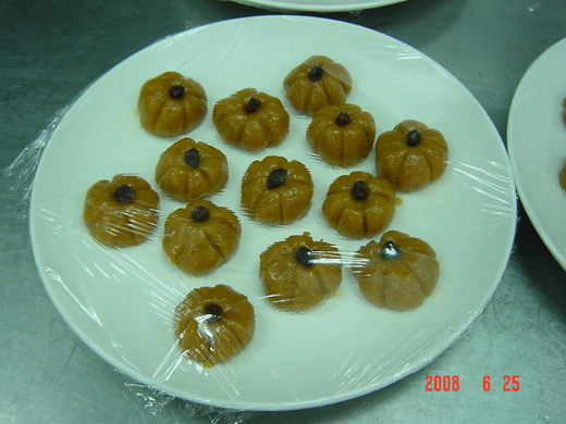 圖三南瓜糕(長得像是灰姑娘馬車的可愛小糕點啦~裡面包有肉餡,南瓜皮吃起來是Qㄉㄟˋㄉㄟˋ~)