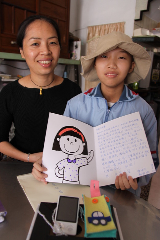 「郁馨,你要加油喔,一定可以恢復健康的!」南投國小學生黃郁馨罹患腫瘤,勇敢接受治療,外界關懷湧進,昨天郁馨收到大家送的禮物和卡片,讓郁馨感動,直說她會繼續對抗腫瘤,恢復健康。 南投國小六年級女生黃郁馨,兩年前腦部發現腫瘤,多次開刀。她樂觀面對治療,還認真讀書維持學業,獲選南投家扶中心今年自強兒童。 她年紀雖小,但樂觀對抗疾病的精神,讓不少大人也敬佩。這幾天陸續有民眾打電話到家扶中心,表示要捐款要送禮物,幫助家境並不富裕的郁馨,讓她更能安心對抗病魔。 昨天家扶中心主任林平烘,到黃家探視並轉達外界的關懷。其中,一對陳姓夫婦,除了送了一台「MP4」隨身聽,希望讓郁馨聽音樂,暫時忘記疾病痛苦。 陳姓夫婦的女兒更親手縫製了MP4的隨身袋子,並且畫了一張可愛小女孩的圖畫卡。 他們祝福郁馨會恢復健康,和陳家的女兒一樣,參加基測和大學指考。 看到信中滿滿祝福,黃郁馨和媽媽阮金簪都相當感動。阮金簪說:「外界的關心,郁馨都收到了,謝謝大家!」郁馨說,她會繼續鼓起勇氣,接受各種治療,努力讓身體恢復健康。 郁馨從去年起,便開始利用治療的空檔,學習畫漫畫,滿滿的筆記本上,都是她親手畫的漫畫人物,她說,等她身體好一點,她會畫漫畫送給陳叔叔,感謝大家的關心。 |