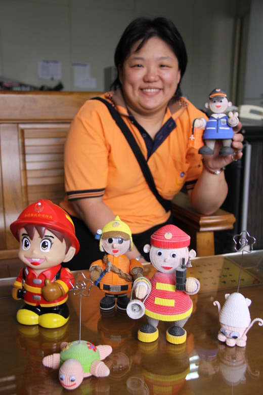 南投縣消防局鳳凰志工分隊組長蔡蓓茱是埔里鎮人,她最近利用埔里鎮的瓦楞紙,以消防公仔為範本,創作出瓦楞紙消防寶寶,造型逗趣又可愛,受到打火弟兄歡迎,更佩服蔡蓓茱的好手藝。 蔡蓓珠和母親陳美蓉加入鳳凰志工逾10年,是有名的鳳凰母女檔。蔡蓓茱熱心消防宣導外,更喜歡收藏消防公仔,包括消防、救護、救助等各種造型公仔,她都沒錯過。 去年,蔡蓓茱參觀埔里鎮的造紙廠,對業者開發的瓦楞紙工藝相當著迷,便自行研究。她熱心鑽研雙手又靈巧,很快便以瓦楞紙做出章魚等動物造型名片夾,她樂於分享,將這些小文具送給打火弟兄,受到大家歡迎。 最近,蔡蓓茱想到,何不利用瓦楞紙創作消防公仔,雖然她沒有用瓦楞紙創作人形公仔經驗。她相當投入,白天在速食店工作,一有空便拿出瓦楞紙設計。 她說,瓦楞紙主要呈方、圓等幾何造型,要利用瓦楞紙做出消防頭盔等立體圓弧線條,難度比較高,她失敗了好幾次,終於掌握訣竅。 最近,她成功以瓦楞紙創作出救護員、消防員和救助隊員三款消防寶寶。這些公仔造型逗趣可愛,甚至連無線電、急救包、斧等配備也具體而微,讓人佩服蔡蓓茱巧手。 |