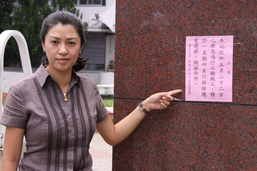 南投市南崗國中昨天出現假南投市公所公告,要求限期拆除建築,市長許淑華前往察看,發現假公告沿著大庄路張貼,造成當地居民誤解、不安,讓她相當氣憤,已經報警追查張貼者身分,將追究刑責。 「本地段已於5月22日發包進行工程施工,請於一星期內拆除現有建築,謝謝合作」署名南投市公所的公告,昨天張貼在南投市南崗國中大門口,因為限期拆除引起居民緊張,向市公所詢問,市長許淑華前往察看,發現大庄路在南崗國中兩側路段,共被張貼32張假公告。 居民看到許淑華出現,要找市長「算帳」,質疑市公所為何要拆除民宅,許淑華連忙澄清,這張公告不是市公所張貼,也無工程施工。 南崗國中警衛表示,這張公告是前天下午有兩名男子張貼,表示市公所要建人行步道,要求拆除學校圍牆及大門。校方表示,學校圍牆用地都屬學校所有,原以為市公要強制拆除學校圍牆,看到許淑華,才知道是有人惡作劇。 大庄路居民也說,前一陣子便有人自稱是公所包商,到大庄路勘查。有居民看到限期拆屋的公告,擔心房子沒了,擔心到睡不著。 許淑華說,她將在明天隨馬英九總統出訪中南美洲,卻有人在假日假造公所名義,造成民眾驚慌,動機相當可惡,她已經報警,請警方追查張貼者身分,追究法律責任。 |