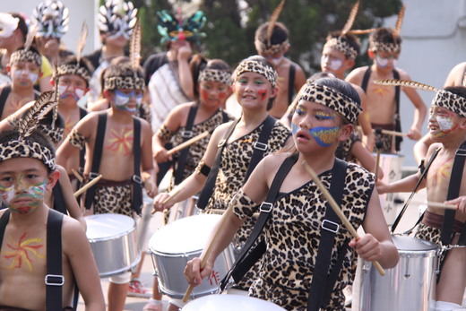 「咚咚咚、咚咚咚」參加夢想嘉年華活動的9所國中小學生隊伍,昨天下午齊聚在中興新村921感恩紀念公園,小選手賣力敲擊森巴鼓,動人心弦的鼓聲,讓民眾也跟著手舞足蹈起來。南投縣長李朝卿也換上色彩鮮豔的羽毛裝,扮演森巴舞者跟著起舞。
