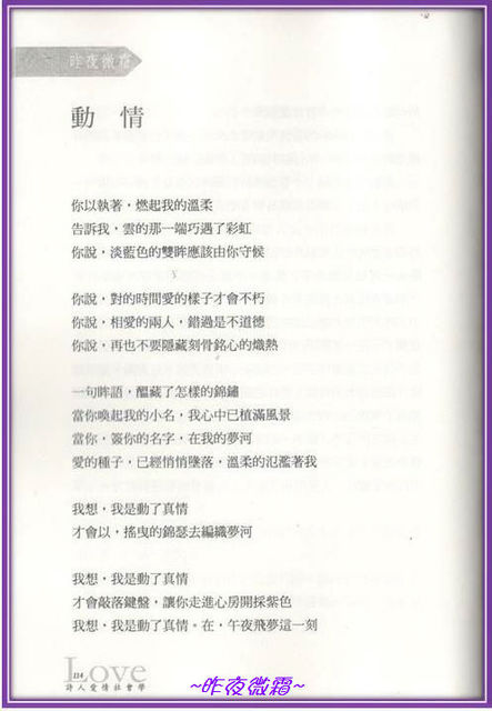 《詩人愛情社會學》是本合集,收錄40位詩人的作品,每位詩人一詩一文的集結;書裡收錄微霜的一首詩〈動情〉以及一篇文〈教師節寫__我的男友〉。