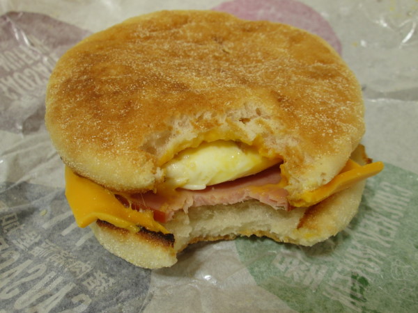 鹹鹹軟軟的麵包,中間夾著雞蛋、火腿跟起士片,吃起來沒有很感動的感覺,我還是比較喜歡倒掉的香雞城的那種上下漢堡包切口烤到脆脆的,然後中間夾美生菜(配沙拉醬)、漢堡肉、還有蕃茄片或起士片,咬起來香氣濃郁,超級好吃,可惜倒店了。