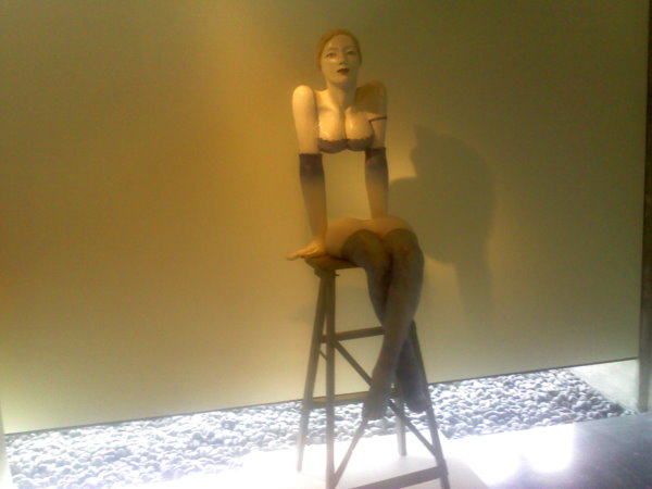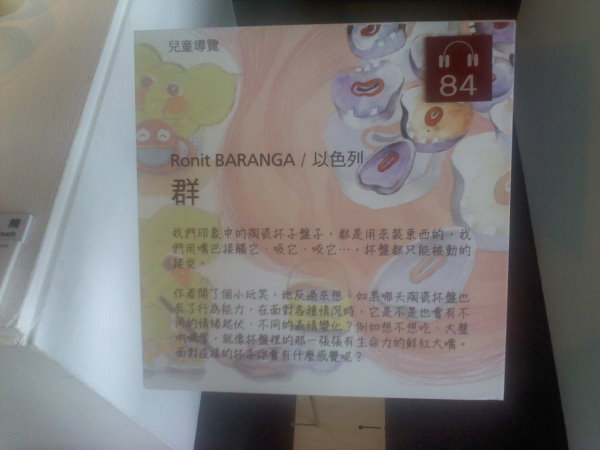 作品本身我覺得看起來沒有特別的感動,但作品後面有很帥的,外貌略似阿湯哥的外國老師站在那邊帶小孩,哈,真的好帥,而且看起來像個溫柔又有耐心的人,個子很高,舉止有一種美感,雖然我常見到外國人,不過像這層次等級的,還是第一次遇見,想跟他說HI,拍張照好嗎?但當然沒這麼說,這照片也是無意中拍下的,是拍完後轉身才望見,世上竟然有長這樣子的人,或許近看就沒這麼好看也說不定?呵呵,照片也只拍了一個模糊身影,一期一會吧。
