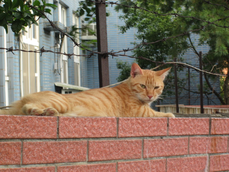 趴在學校圍牆上曬夕陽的貓。