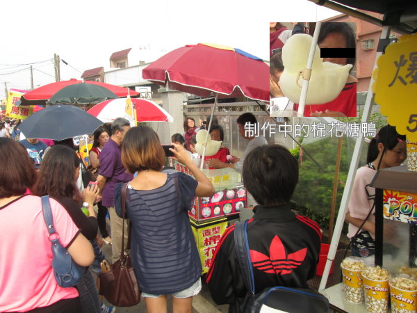 這攤人氣很高,有位爺爺豪氣的買了一隻現點現做的棉花糖鴨要給孫子,大家沾他的光,在現場拿起相機手機猛拍,可是最重要的成品我沒有拍到(殘念),因為人家小孩已經拿到手上準備要好好享用了,這時跑去拍好像很奇怪?只能飲恨放棄。