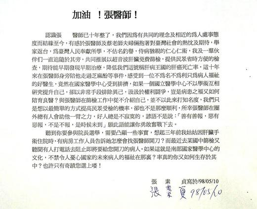 我從日本返台後深刻感受到日本預防醫學的進步,各種癌症之篩檢工作,都有基層的工作人員與醫師定期去各處巡迴篩檢。他們的早期胃癌診斷率高達70%以上,領先全世界,治療後成績也是世界第一,部分之病人可免除開刀,僅用胃鏡即可根除。我最專門的是肝臟外科,回台後常見新聞報導肝癌發現時已無法手術切除之憾事。門診也常有年輕男性已無法開刀切除肝癌,年輕妻子嚎啕大哭問為什麼會這樣的場面出現。所以十幾年前我與現在已退休的衛生局保健課張素貞課長及衛生局已退休義工們組成肝癌篩檢小組定期不定點在市區內做免費腹部超音波的肝癌篩檢。因為老師上課忙、沒時間去醫院,我們就由學校開始、一間接著一間的去巡迴檢查。接到上述電話隔週,我與張課長去已接洽好的中山國中義診,負責的學校護士馬上說她同事的媽媽本來預定上星期安排讓我開刀,因為接到上述電話嚇得不敢去我們醫院,已改去他院開刀。她同事說我會做義診工作應該不是壞醫師。我欲請校護的同事出面證明有此電話一事,因其父親怕惹是生非而反對。我以老師應支持公理正義才能教育我們的下一代為由,說服她寄email給我們院長〈見附檔〉,但院方卻以未收到email回覆我。有位即將退休之本院公關主任答應我要查證此事之真相,我提供