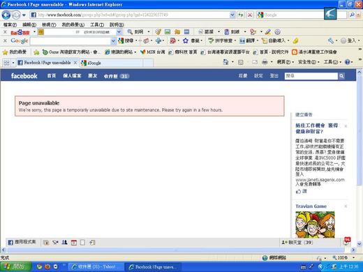 其二,也是最詭異的,就是我沒有在開啟其他的社團網頁時遇到任何問題,只有嘗試開啟馬英九民怨總部時遇到「網站維護」的訊息。