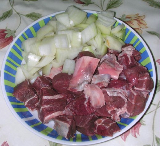 4.砂鍋中放少許油小火炒香洋蔥,再加入牛腩拌炒數下