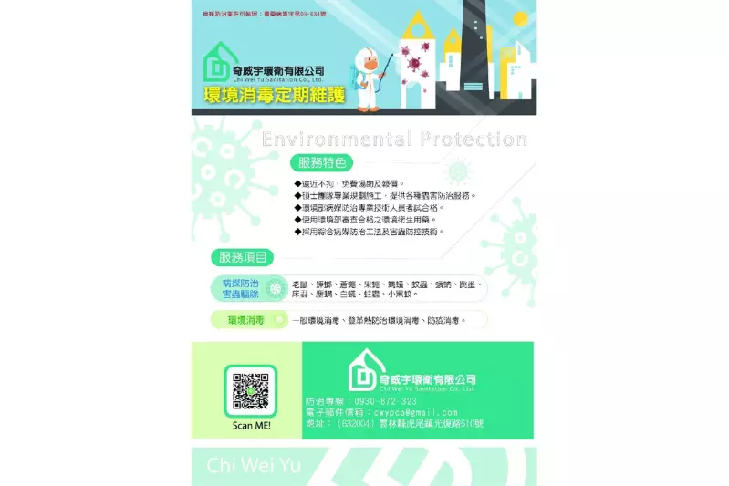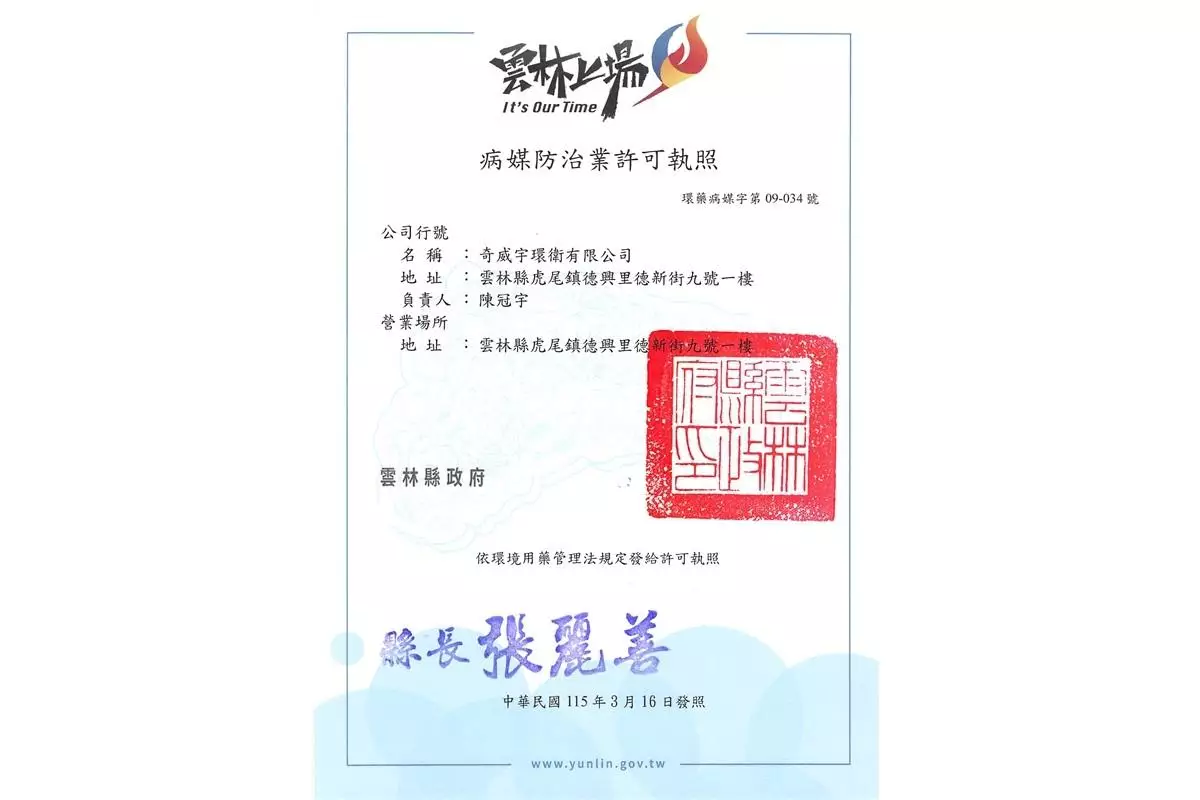 奇威宇環衛有限公司位於雲林縣虎尾鎮,專業提供病媒防治、環境消毒、害蟲驅除、白蟻防治、滅鼠、蟑螂防治,以及餐廳、幼稚園、學校、公司行號等各類場所消毒服務,同時提供電腦維修等多元服務。公司擁有專業技術團隊與安全藥劑施作經驗,服務範圍涵蓋全省、全台地區,致力於為客戶打造安全、健康、無蟲害的生活與工作環境,滿足家庭、企業及公共空間的多元需求。