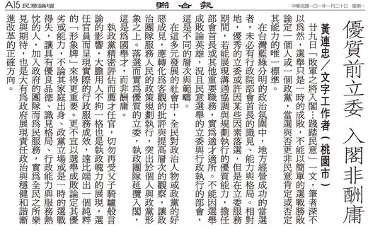 優質前立委 入閣非酬庸 【聯合報 ╱ 黃連忠/文字工作者(桃園市 ) 】 2012.01.30 02:43 am