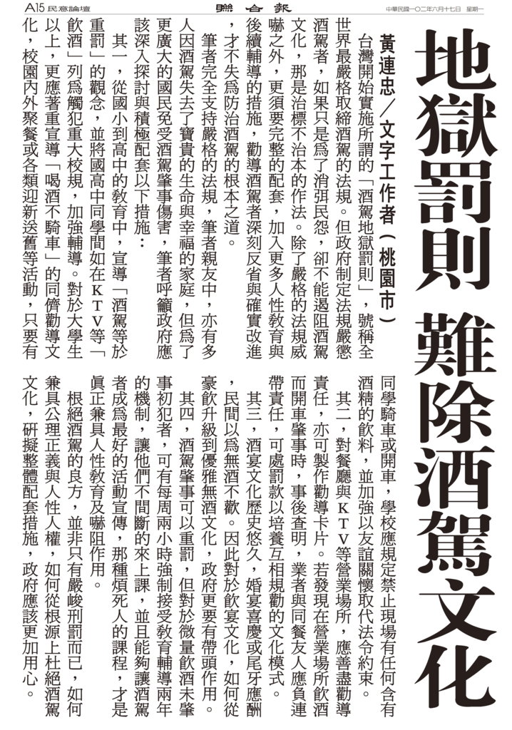 地獄罰則 難除酒駕文化 http://udn.com/NEWS/OPINION/X1/7967719.shtml 【聯合報╱黃連忠/文字工作者(桃園市)】 2013.06.17 02:07 am 台...