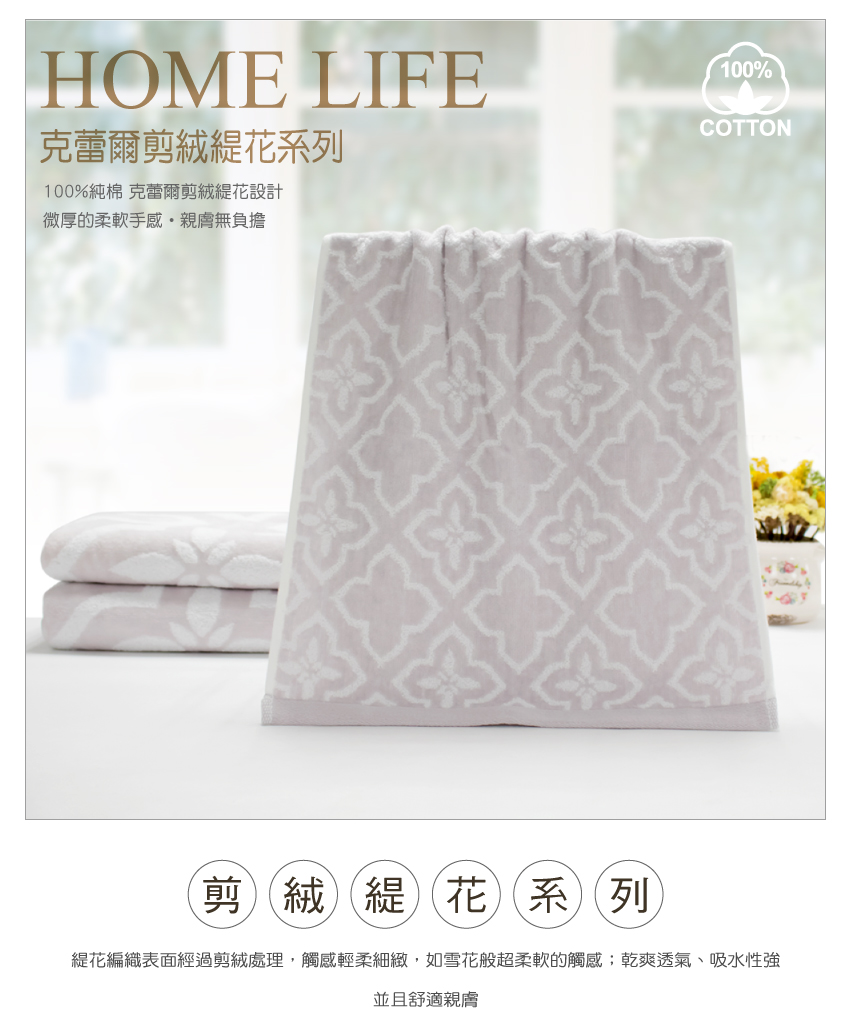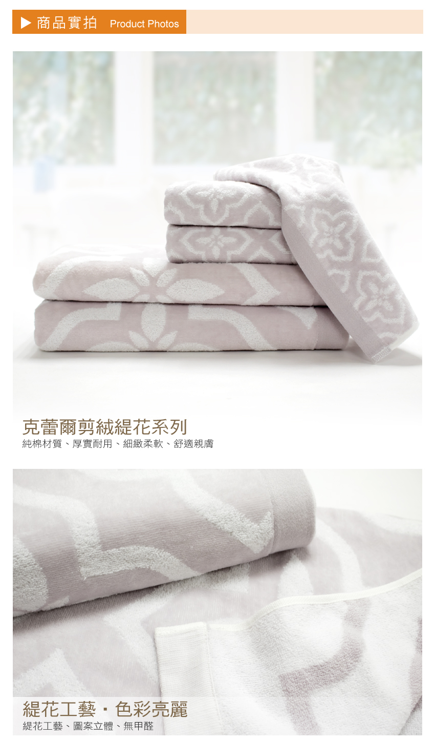這款【克蕾爾剪絨緹花方巾】表面經過剪絨處理,手感微厚蓬鬆,觸感細緻柔軟,吸水性出色優異。是百分之百天然棉的典雅民族風設計,一般方巾使用。