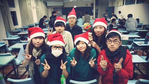 報告時這禮拜二報告時我們那組戴聖誕帽穿學生服