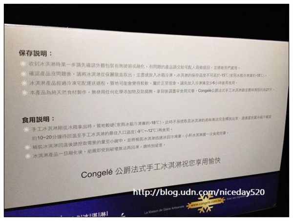 包裝頂上印製著Congele公爵的Logo,側邊則是冰淇淋的保存及食用注意事項。