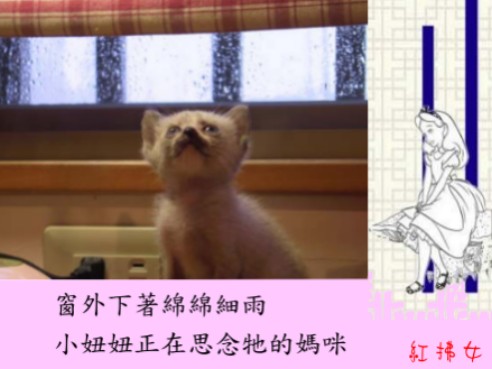 話說上回看官們瞭了我家阿扁的身世,今天再談談我家小豆豆,牠雖然與名主持陶晶瑩剛產下的千金同名,但身世可要坎坷多了,因為牠還沒斷奶,媽咪就因過馬路時不小心慘死輪下,留下一窩貓仔仔餓得直叫。牠們的窩就在廢棄的教室一個隱密的櫃子裡,小朋友聽見了把牠們挖出來,被我撞見時,他們正拿波卡餵小豆豆,眼還沒睜開呢,更別說長牙了,我的天呀!我趕緊把牠搶救下來,牠有個姊姊長得肥肥壯壯的,很可愛,於是好人做到底一併帶回家,救救這可憐的一對小孤兒。(後來我才知道原來姊姊吃起奶來粉猛,所以才會長得那麼壯)