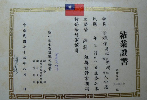 結業時,我請兩位大師在我的結業證書上簽名留念。當胡導演看到我的籍貫是河北省時,便說:我們是同鄉哦!於是特別看了一下我的名字,又說:你的本名很好,可以不必另取筆名了。因他這句話,從此我發表作品便都用「紫楓」為筆名了。